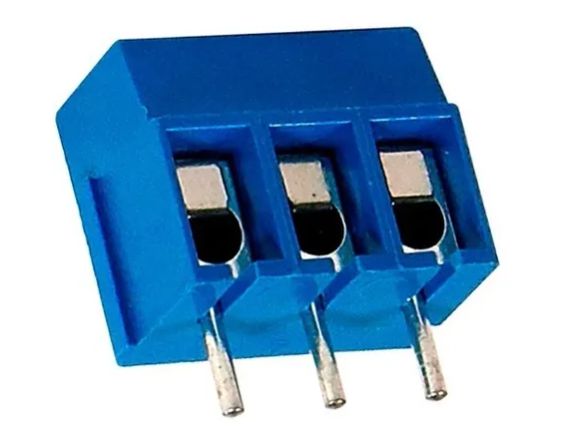 Geralmente utilizado como terminal de conexão para rápida para alimentação de energia ou informações. Na parte inferior possui 3 pinos para soldar em placas e 3 parafusos fenda na parte superior.