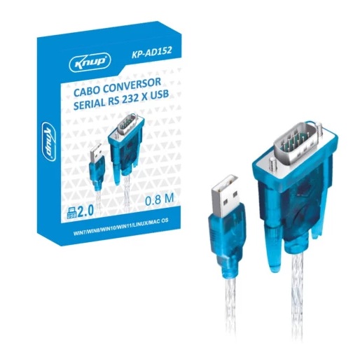 O Cabo Conversor Knup KP-AD152 permite a comunicação entre dispositivos com porta serial RS232 e computadores modernos com entrada USB 2.0. Ideal para a conexão de equipamentos industriais, leitores de código de barras, impressoras fiscais, roteadores, instrumentos de medição e outros dispositivos legados que utilizam interface serial.
