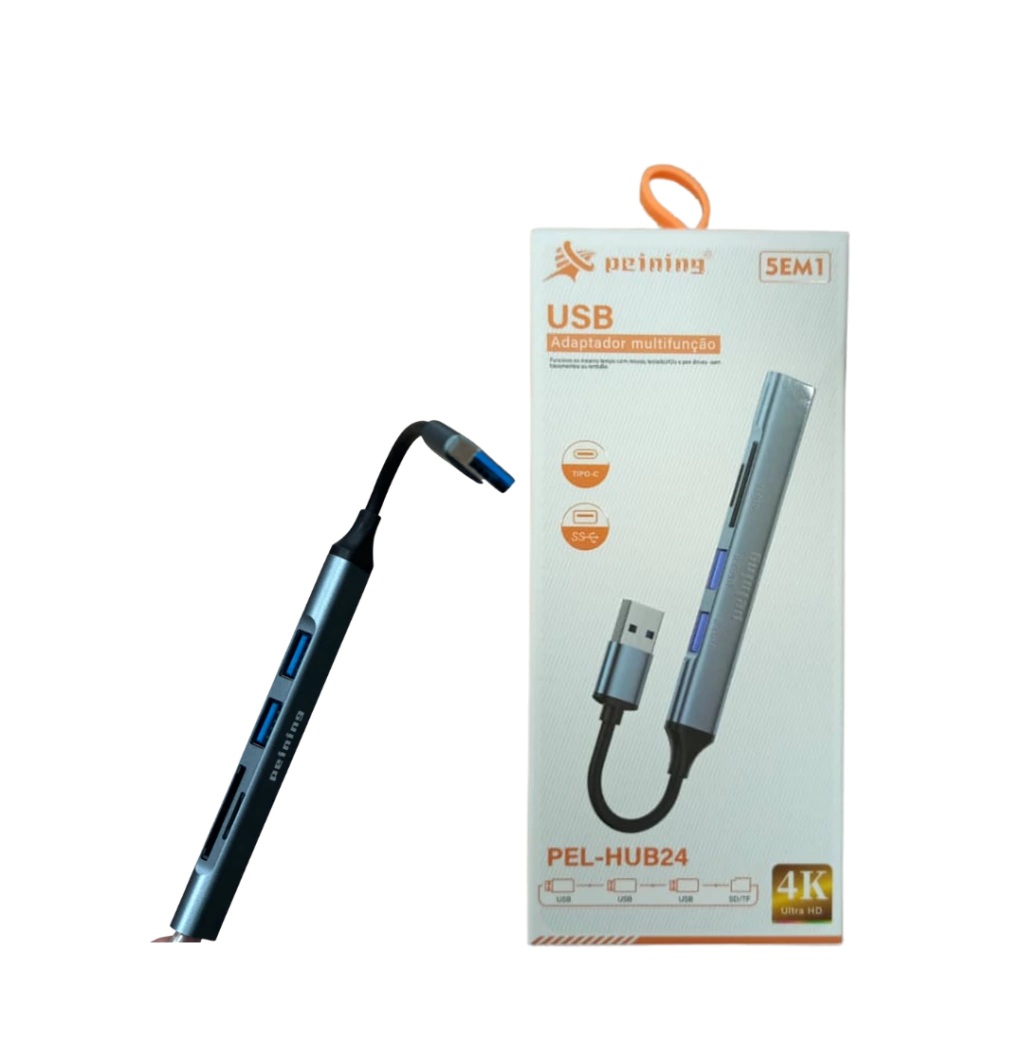 Adaptador multifuncional Peining PEL-HUB24 — hub compacto que expande portas para produtividade: HDMI 4K, Ethernet Gigabit, Power Delivery, múltiplas portas USB 3.0, leitor de cartões SD/TF e mais. Plug & play, ideal para home office, streaming, apresentações e armazenamento externo.