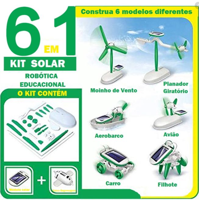 Construa seu próprio kit solar com esse kit. São eis modelos de trabalho diferentes, incluindo Carro solar, cachorro, aerobarco, avião solar, moinho de vento e plano giratório.