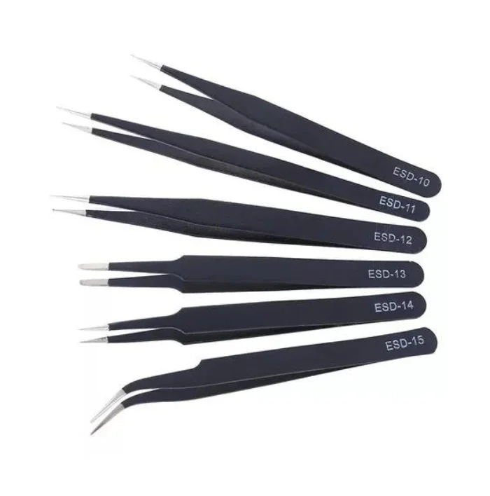 O Kit com 6 Pinças Anti-estáticas ESD-10 a ESD-15 é essencial para manuseio seguro de componentes eletrônicos sensíveis à estática. Fabricadas em material de alta qualidade, as pinças oferecem precisão e controle, permitindo trabalhos detalhados e delicados. Cada pinça é projetada para uma aplicação específica, desde a manipulação de pequenos componentes até a montagem de circuitos complexos. Ideais para uso em laboratórios de eletrônica, reparos de dispositivos e montagem de circuitos. O revestimento antiestático protege os componentes contra danos, garantindo segurança e eficiência em suas tarefas.