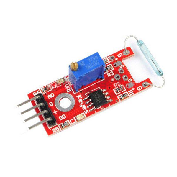 O Reed Switch é um componente vastamente utilizado em diversas áreas, tem o seu funcionamento baseado na abertura ou fechamento de seus contatos dependendo da ação que um campo magnético externo exerce sobre ele, ou seja, funciona como um interruptor. É constituído por um bulbo de vidro em seu interior e duas lâminas flexíveis sensíveis a ação de um campos magnéticos, em condições normais, as lâminas estão separadas e não conduzem corrente elétrica, operando dessa forma, como uma chave aberta, já sob aproximação de um gerador de campo magnético como imã, o campo magnético magnetiza as lâminas e gera a atração entre elas, o que causa o fechamento dos contatos e consequente condução de corrente. Tem como exemplo de aplicações: alarme, sensor de presença ou passagem de determinado objeto, etc.