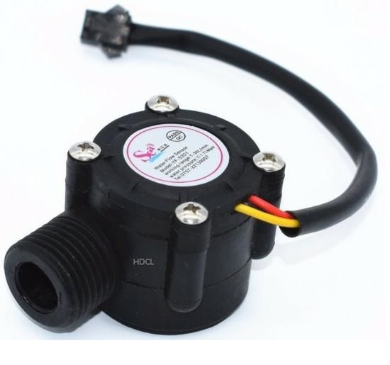 Pode medir a quantidade de água que passa pelo cano, podendo assim controlar o volume desejado. Possui um rotor interno e um sensor de efeito Hall. Quando a água passa pelo rotor, são gerados pulsos proporcionais a velocidade do rotor. Trabalha com a faixa de vazão de 1 a 30L por minuto e a tensão de operação é de 5 a 18 VDC, sendo a tensão nominal de 5VDC.